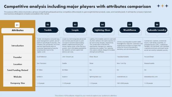 There are so many reasons you need a Competitive Analysis Including Major On Demand Laundry Business Plan Graphics Pdf The first reason is you can not spend time making everything from scratch, Thus, Slidegeeks has made presentation templates for you too. You can easily download these templates from our website easily. The purpose of this slide is to provide a glimpse of significant participants and key competitors of the industry to gain insight into their products, sales, and marketing tactic. It will help the company implement new business strategies to compete successfully in the market.