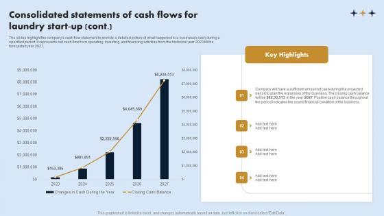 Get a simple yet stunning designed Consolidated Statements Of Cash Flows On Demand Laundry Business Plan Rules Pdf It is the best one to establish the tone in your meetings. It is an excellent way to make your presentations highly effective. So, download this PPT today from Slidegeeks and see the positive impacts. Our easy to edit Consolidated Statements Of Cash Flows On Demand Laundry Business Plan Rules Pdf can be your go to option for all upcoming conferences and meetings. So, what are you waiting for Grab this template today. The slides highlight the companys cash flow statement to provide a detailed picture of what happened to a businesss cash during a specified period. It represents net cash flow from operating, investing, and financing activities from the historical year 2023 till the forecasted year 2027.