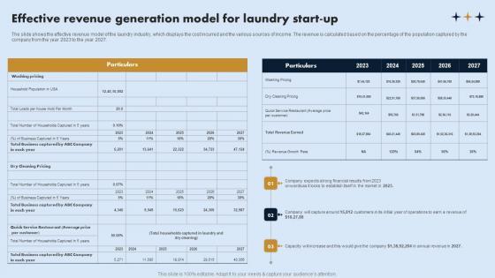 Do you have an important presentation coming up Are you looking for something that will make your presentation stand out from the rest Look no further than Effective Revenue Generation Model For On Demand Laundry Business Plan Introduction Pdf With our professional designs, you can trust that your presentation will pop and make delivering it a smooth process. And with Slidegeeks, you can trust that your presentation will be unique and memorable. So why wait Grab Effective Revenue Generation Model For On Demand Laundry Business Plan Introduction Pdf today and make your presentation stand out from the rest. The slide shows the effective revenue model of the laundry industry, which displays the cost incurred and the various sources of income. The revenue is calculated based on the percentage of the population captured by the company from the year 2023 to the year 2027.