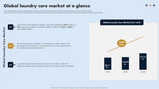 The purpose of this slide is to highlight the market size of the global laundry care market, including its share in 2021, 2022, forecasted value in 2028, and its CAGR. It also depicts the growing demand for laundry care products that led to the worldwide expansion of laundry care market.If you are looking for a format to display your unique thoughts, then the professionally designed Global Laundry Care Market At A Glance Laundromat Business Plan Go To Market Designs Pdf is the one for you. You can use it as a Google Slides template or a PowerPoint template. Incorporate impressive visuals, symbols, images, and other charts. Modify or reorganize the text boxes as you desire. Experiment with shade schemes and font pairings. Alter, share or cooperate with other people on your work. Download Global Laundry Care Market At A Glance Laundromat Business Plan Go To Market Designs Pdf and find out how to give a successful presentation. Present a perfect display to your team and make your presentation unforgettable. The purpose of this slide is to highlight the market size of the global laundry care market, including its share in 2021, 2022, forecasted value in 2028, and its CAGR. It also depicts the growing demand for laundry care products that led to the worldwide expansion of laundry care market.