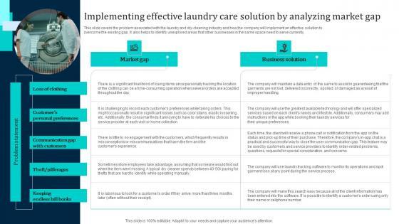 This slide covers the problem associated with the laundry and dry-cleaning industry and how the company will implement an effective solution to overcome the existing gap. It also helps to identify unexplored areas that other businesses in the same space need to serve currently. Crafting an eye-catching presentation has never been more straightforward. Let your presentation shine with this tasteful yet straightforward Implementing Effective Laundry Care Solution Laundromat Business Plan Go To Market Formats Pdf template. It offers a minimalistic and classy look that is great for making a statement. The colors have been employed intelligently to add a bit of playfulness while still remaining professional. Construct the ideal Implementing Effective Laundry Care Solution Laundromat Business Plan Go To Market Formats Pdf that effortlessly grabs the attention of your audience. Begin now and be certain to wow your customers. This slide covers the problem associated with the laundry and dry cleaning industry and how the company will implement an effective solution to overcome the existing gap. It also helps to identify unexplored areas that other businesses in the same space need to serve currently.