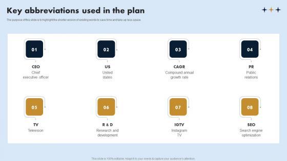 Formulating a presentation can take up a lot of effort and time, so the content and message should always be the primary focus. The visuals of the PowerPoint can enhance the presenters message, so our Key Abbreviations Used In The Plan On Demand Laundry Business Plan Pictures Pdf was created to help save time. Instead of worrying about the design, the presenter can concentrate on the message while our designers work on creating the ideal templates for whatever situation is needed. Slidegeeks has experts for everything from amazing designs to valuable content, we have put everything into Key Abbreviations Used In The Plan On Demand Laundry Business Plan Pictures Pdf The purpose of this slide is to highlight the shorter version of existing words to save time and take up less space.