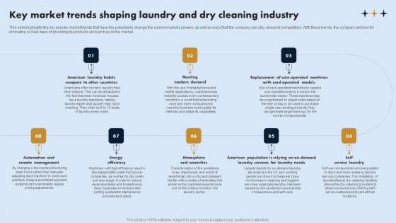 This slide highlights the key laundry market trends that have the potential to change the current market scenario, as well as ways that the company can stay ahead of competitors. With these trends, the company will look for innovative or new ways of providing its products and services in the market.This modern and well-arranged Key Market Trends Shaping Laundry And Dry Laundromat Business Plan Go To Market Infographics Pdf provides lots of creative possibilities. It is very simple to customize and edit with the Powerpoint Software. Just drag and drop your pictures into the shapes. All facets of this template can be edited with Powerpoint no extra software is necessary. Add your own material, put your images in the places assigned for them, adjust the colors, and then you can show your slides to the world, with an animated slide included. This slide highlights the key laundry market trends that have the potential to change the current market scenario, as well as ways that the company can stay ahead of competitors. With these trends, the company will look for innovative or new ways of providing its products and services in the market.