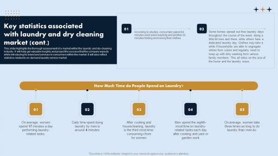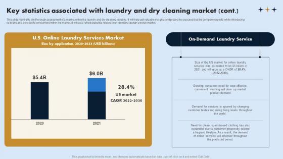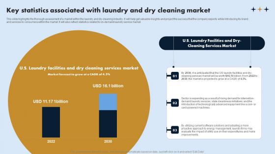 This Key Statistics Associated With Laundry On Demand Laundry Business Plan Download Pdf is perfect for any presentation, be it in front of clients or colleagues. It is a versatile and stylish solution for organizing your meetings. The product name features a modern design for your presentation meetings. The adjustable and customizable slides provide unlimited possibilities for acing up your presentation. Slidegeeks has done all the homework before launching the product for you. So, do not wait, grab the presentation templates today This slide highlights the thorough assessment of a market within the laundry and dry cleaning industry. It will help get valuable insights and project the success that the company expects while introducing its brand and services to consumers within the market. It will also reflect statistics related to on demand laundry service market.