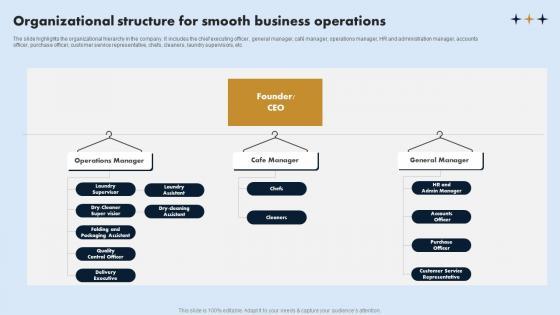Are you searching for a Organizational Structure For Smooth Business On Demand Laundry Business Plan Demonstration Pdf that is uncluttered, straightforward, and original Its easy to edit, and you can change the colors to suit your personal or business branding. For a presentation that expresses how much effort you have put in, this template is ideal. With all of its features, including tables, diagrams, statistics, and lists, its perfect for a business plan presentation. Make your ideas more appealing with these professional slides. Download Organizational Structure For Smooth Business On Demand Laundry Business Plan Demonstration Pdf from Slidegeeks today. The slide highlights the organizational hierarchy in the company. It includes the chief executing officer, general manager, cafe manager, operations manager, HR and administration manager, accounts officer, purchase officer, customer service representative, chefs, cleaners, laundry supervisors, etc.