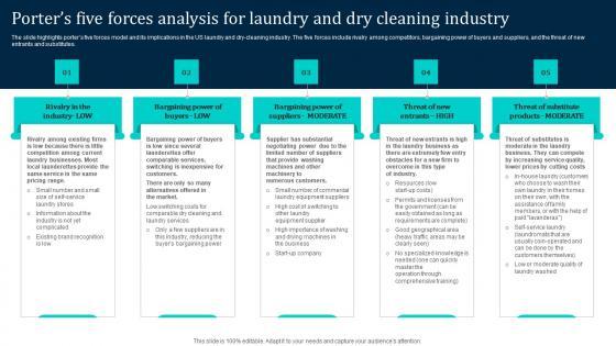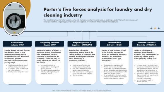 Retrieve professionally designed Porters Five Forces Analysis For Laundry On Demand Laundry Business Plan Information Pdf to effectively convey your message and captivate your listeners. Save time by selecting pre made slideshows that are appropriate for various topics, from business to educational purposes. These themes come in many different styles, from creative to corporate, and all of them are easily adjustable and can be edited quickly. Access them as PowerPoint templates or as Google Slides themes. You do not have to go on a hunt for the perfect presentation because Slidegeeks got you covered from everywhere. The slide highlights porters five forces model and its implications in the US laundry and dry cleaning industry. The five forces include rivalry among competitors, bargaining power of buyers and suppliers, and the threat of new entrants and substitutes.