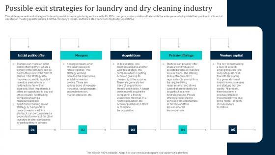 This slide represents exit strategies for laundry and dry-cleaning industry such as sell-offs, IPOs, mergers, and acquisitions that enable the entrepreneur to liquidate their position in a financial asset upon meeting specific criteria, limit the companys losses, and take a step back from day-to-day operations.Slidegeeks has constructed Possible Exit Strategies For Laundry And Laundromat Business Plan Go To Market Microsoft Pdf after conducting extensive research and examination. These presentation templates are constantly being generated and modified based on user preferences and critiques from editors. Here, you will find the most attractive templates for a range of purposes while taking into account ratings and remarks from users regarding the content. This is an excellent jumping-off point to explore our content and will give new users an insight into our top-notch PowerPoint Templates. This slide represents exit strategies for laundry and dry cleaning industry such as sell offs, IPOs, mergers, and acquisitions that enable the entrepreneur to liquidate their position in a financial asset upon meeting specific criteria, limit the companys losses, and take a step back from day to day operations.