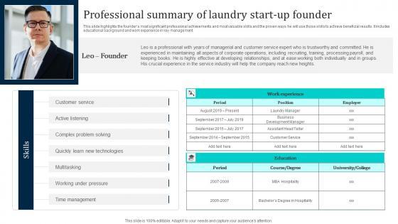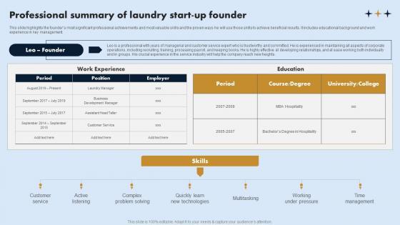 Presenting this PowerPoint presentation, titled Professional Summary Of Laundry Start Up Founder On Demand Laundry Business Plan Mockup Pdf with topics curated by our researchers after extensive research. This editable presentation is available for immediate download and provides attractive features when used. Download now and captivate your audience. Presenting this Professional Summary Of Laundry Start Up Founder On Demand Laundry Business Plan Mockup Pdf Our researchers have carefully researched and created these slides with all aspects taken into consideration. This is a completely customizable Professional Summary Of Laundry Start Up Founder On Demand Laundry Business Plan Mockup Pdf that is available for immediate downloading. Download now and make an impact on your audience. Highlight the attractive features available with our PPTs. This slide highlights the founders most significant professional achievements and most valuable skills and the proven ways he will use those skills to achieve beneficial results. It includes educational background and work experience in key management.