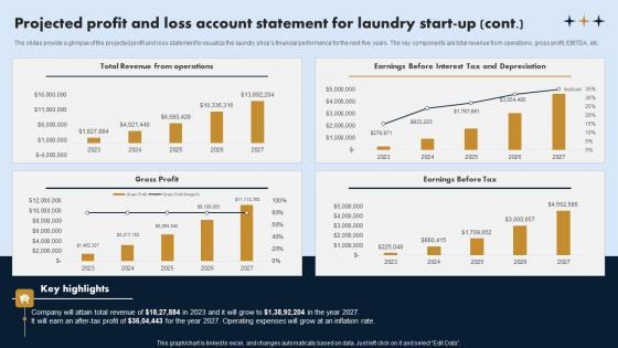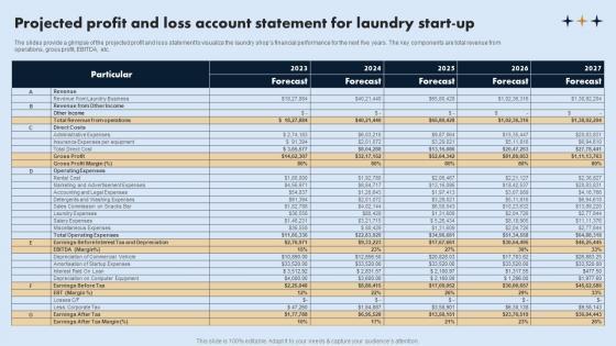 Here you can discover an assortment of the finest PowerPoint and Google Slides templates. With these templates, you can create presentations for a variety of purposes while simultaneously providing your audience with an eye catching visual experience. Download Projected Profit And Loss Account Statement On Demand Laundry Business Plan Summary Pdf to deliver an impeccable presentation. These templates will make your job of preparing presentations much quicker, yet still, maintain a high level of quality. Slidegeeks has experienced researchers who prepare these templates and write high quality content for you. Later on, you can personalize the content by editing the Projected Profit And Loss Account Statement On Demand Laundry Business Plan Summary Pdf The slides provide a glimpse of the projected profit and loss statement to visualize the laundry shops financial performance for the next five years. The key components are total revenue from operations, gross profit, EBITDA, etc.