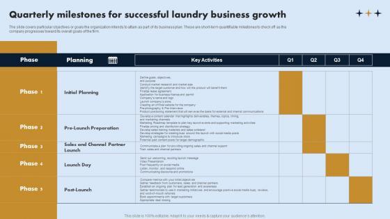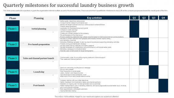 The slide covers particular objectives or goals the organization intends to attain as part of its business plan. These are short-term quantifiable milestones to check off as the company progresses toward its overall goals of the firm.This Quarterly Milestones For Successful Laundry Laundromat Business Plan Go To Market Clipart Pdf from Slidegeeks makes it easy to present information on your topic with precision. It provides customization options, so you can make changes to the colors, design, graphics, or any other component to create a unique layout. It is also available for immediate download, so you can begin using it right away. Slidegeeks has done good research to ensure that you have everything you need to make your presentation stand out. Make a name out there for a brilliant performance. The slide covers particular objectives or goals the organization intends to attain as part of its business plan. These are short term quantifiable milestones to check off as the company progresses toward its overall goals of the firm.