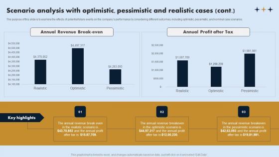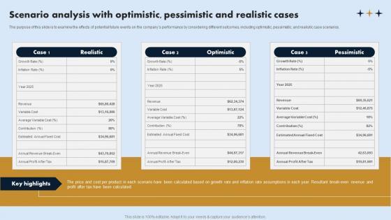 Take your projects to the next level with our ultimate collection of Scenario Analysis With Optimistic Pessimistic On Demand Laundry Business Plan Diagrams Pdf Slidegeeks has designed a range of layouts that are perfect for representing task or activity duration, keeping track of all your deadlines at a glance. Tailor these designs to your exact needs and give them a truly corporate look with your own brand colors they all make your projects stand out from the rest. The purpose of this slide is to examine the effects of potential future events on the companys performance by considering different outcomes, including optimistic, pessimistic, and realistic case scenarios.