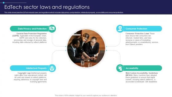 This slide showcases the EdTech industry laws and regulations which includes data privacy and protection, intellectual property, accessibility and consumer protection. Do you have an important presentation coming up Are you looking for something that will make your presentation stand out from the rest Look no further than Global Digital Education Edtech Sector Laws And Regulations IR SS V. With our professional designs, you can trust that your presentation will pop and make delivering it a smooth process. And with Slidegeeks, you can trust that your presentation will be unique and memorable. So why wait Grab Global Digital Education Edtech Sector Laws And Regulations IR SS V today and make your presentation stand out from the rest This slide showcases the EdTech industry laws and regulations which includes data privacy and protection, intellectual property, accessibility and consumer protection.