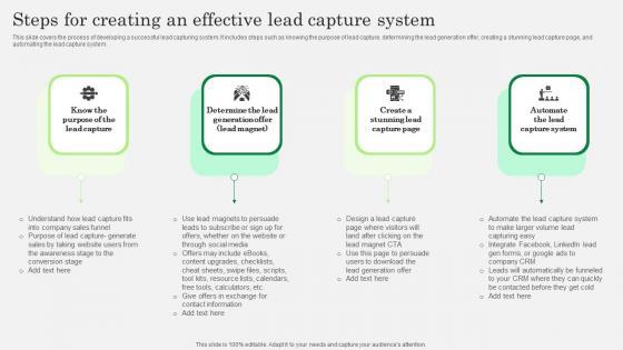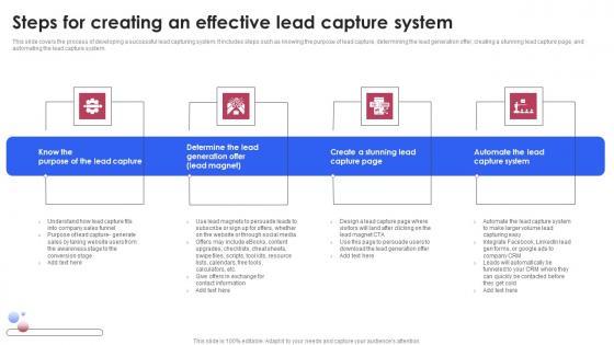 This slide covers the process of developing a successful lead capturing system. It includes steps such as knowing the purpose of lead capture, determining the lead generation offer, creating a stunning lead capture page, and automating the lead capture system. Are you searching for a Steps For Creating An Effective Lead Capture System Improving Lead Generation Process Ideas PDF that is uncluttered, straightforward, and original Its easy to edit, and you can change the colors to suit your personal or business branding. For a presentation that expresses how much effort you have put in, this template is ideal With all of its features, including tables, diagrams, statistics, and lists, its perfect for a business plan presentation. Make your ideas more appealing with these professional slides. Download Steps For Creating An Effective Lead Capture System Improving Lead Generation Process Ideas PDF from Slidegeeks today.