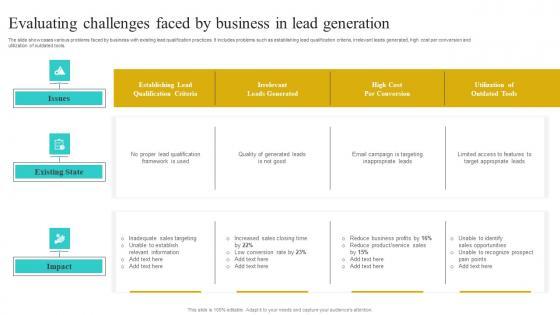 The slide showcases various problems faced by business with existing lead qualification practices. It includes problems such as establishing lead qualification criteria, irrelevant leads generated, high cost per conversion and utilization of outdated tools. Get a simple yet stunning designed Evaluating Challenges Faced By Business In Lead Generation Sample PDF. It is the best one to establish the tone in your meetings. It is an excellent way to make your presentations highly effective. So, download this PPT today from Slidegeeks and see the positive impacts. Our easy to edit Evaluating Challenges Faced By Business In Lead Generation Sample PDF can be your go to option for all upcoming conferences and meetings. So, what are you waiting for Grab this template today.
