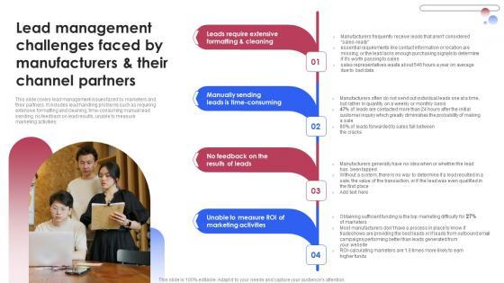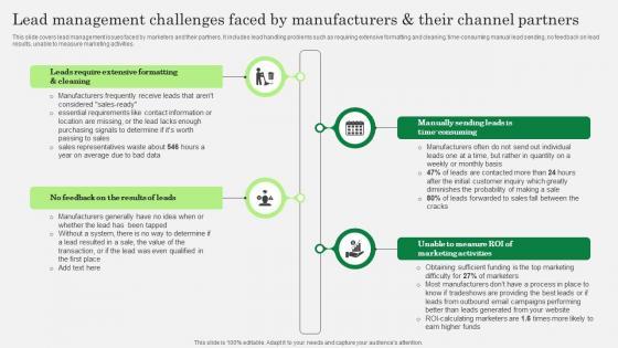 This slide covers lead management issues faced by marketers and their partners. It includes lead handling problems such as requiring extensive formatting and cleaning, time-consuming manual lead sending, no feedback on lead results, unable to measure marketing activities. Slidegeeks is one of the best resources for PowerPoint templates. You can download easily and regulate Lead Management Challenges Faced By Manufacturers And Their Channel Partners Pictures PDF for your personal presentations from our wonderful collection. A few clicks is all it takes to discover and get the most relevant and appropriate templates. Use our Templates to add a unique zing and appeal to your presentation and meetings. All the slides are easy to edit and you can use them even for advertisement purposes.