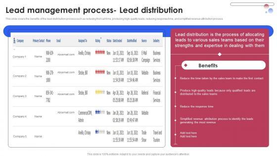 This slide covers the benefits of the lead distribution process such as reducing first call time, producing high-quality leads, reducing response time, and simplified revenue attribution process. From laying roadmaps to briefing everything in detail, our templates are perfect for you. You can set the stage with your presentation slides. All you have to do is download these easy to edit and customizable templates. Lead Management Process Lead Distribution Enhancing Client Lead Conversion Rates Topics PDF will help you deliver an outstanding performance that everyone would remember and praise you for. Do download this presentation today.
