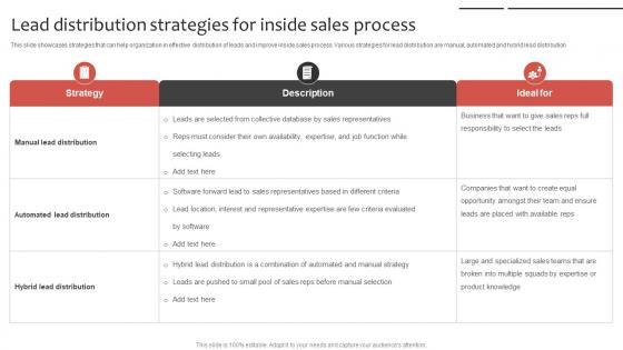 This slide showcases strategies that can help organization in effective distribution of leads and improve inside sales process. Various strategies for lead distribution are manual, automated and hybrid lead distribution. The best PPT templates are a great way to save time, energy, and resources. Slidegeeks have 100 percent editable powerpoint slides making them incredibly versatile. With these quality presentation templates, you can create a captivating and memorable presentation by combining visually appealing slides and effectively communicating your message. Download Phone Sales Strategy To Drive Lead Distribution Strategies For Inside Strategy SS V from Slidegeeks and deliver a wonderful presentation. This slide showcases strategies that can help organization in effective distribution of leads and improve inside sales process. Various strategies for lead distribution are manual, automated and hybrid lead distribution.