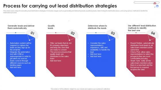 This slide covers steps for executing lead distribution strategies. It includes stages such as generating and delivering leads, qualifying leads, determining the distribution place, and using various methods to identify the distribution process. Welcome to our selection of the Process For Carrying Out Lead Distribution Strategies Enhancing Client Lead Conversion Rates Professional PDF. These are designed to help you showcase your creativity and bring your sphere to life. Planning and Innovation are essential for any business that is just starting out. This collection contains the designs that you need for your everyday presentations. All of our PowerPoints are 100 percent editable, so you can customize them to suit your needs. This multi purpose template can be used in various situations. Grab these presentation templates today.