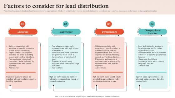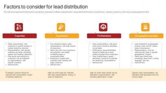 This slide showcases factors that should be considered by organization in effective lead distribution. Various factors that should be considered are expertise, experience, performance and geographical location. Are you in need of a template that can accommodate all of your creative concepts This one is crafted professionally and can be altered to fit any style. Use it with Google Slides or PowerPoint. Include striking photographs, symbols, depictions, and other visuals. Fill, move around, or remove text boxes as desired. Test out color palettes and font mixtures. Edit and save your work, or work with colleagues. Download Telesales Strategy For Targeting Factors To Consider For Lead Distribution Strategy SS V and observe how to make your presentation outstanding. Give an impeccable presentation to your group and make your presentation unforgettable. This slide showcases factors that should be considered by organization in effective lead distribution. Various factors that should be considered are expertise, experience, performance and geographical location.