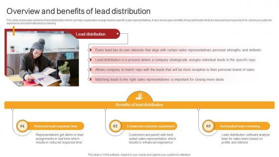 This slide showcases overview of lead distribution which can help organization assign leads to specific sales representatives. It also showcases benefits of lead distribution that are reduced lead response time, enhanced customer experience and automated lead screening. Here you can discover an assortment of the finest PowerPoint and Google Slides templates. With these templates, you can create presentations for a variety of purposes while simultaneously providing your audience with an eye-catching visual experience. Download Overview And Benefits Of Lead Distribution Inside Vs Outside Sales PPT Slide Strategy SS V to deliver an impeccable presentation. These templates will make your job of preparing presentations much quicker, yet still, maintain a high level of quality. Slidegeeks has experienced researchers who prepare these templates and write high-quality content for you. Later on, you can personalize the content by editing the Overview And Benefits Of Lead Distribution Inside Vs Outside Sales PPT Slide Strategy SS V. This slide showcases overview of lead distribution which can help organization assign leads to specific sales representatives. It also showcases benefits of lead distribution that are reduced lead response time, enhanced customer experience and automated lead screening