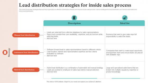 This slide showcases strategies that can help organization in effective distribution of leads and improve inside sales process. Various strategies for lead distribution are manual, automated and hybrid lead distribution. The Remote Sales Plan For Lead Distribution Strategies For Inside Sales Process Strategy SS V is a compilation of the most recent design trends as a series of slides. It is suitable for any subject or industry presentation, containing attractive visuals and photo spots for businesses to clearly express their messages. This template contains a variety of slides for the user to input data, such as structures to contrast two elements, bullet points, and slides for written information. Slidegeeks is prepared to create an impression. This slide showcases strategies that can help organization in effective distribution of leads and improve inside sales process. Various strategies for lead distribution are manual, automated and hybrid lead distribution.