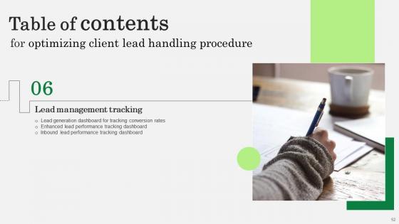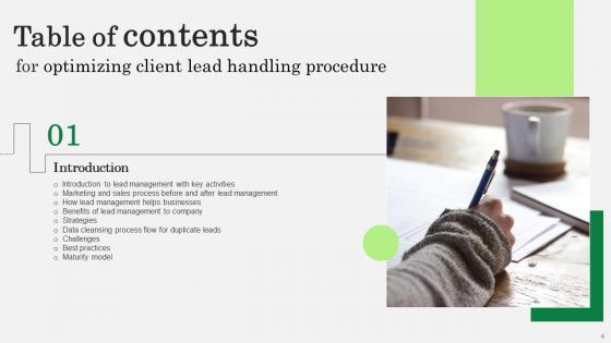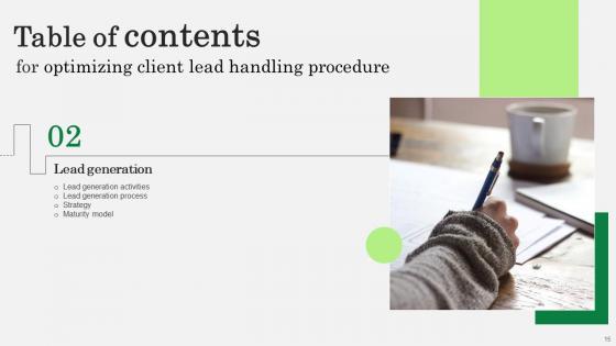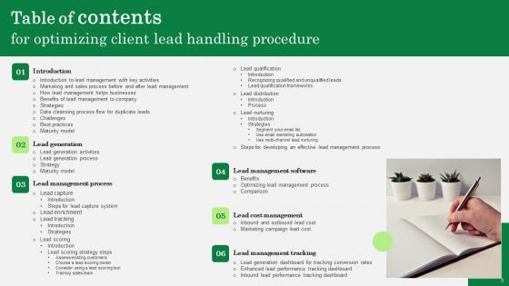 If you are looking for a format to display your unique thoughts, then the professionally designed Table Of Contents Optimizing Client Lead Handling Procedure Information Pdf is the one for you. You can use it as a Google Slides template or a PowerPoint template. Incorporate impressive visuals, symbols, images, and other charts. Modify or reorganize the text boxes as you desire. Experiment with shade schemes and font pairings. Alter, share or cooperate with other people on your work. Download Table Of Contents Optimizing Client Lead Handling Procedure Information Pdf and find out how to give a successful presentation. Present a perfect display to your team and make your presentation unforgettable. Our Table Of Contents Optimizing Client Lead Handling Procedure Information Pdf are topically designed to provide an attractive backdrop to any subject. Use them to look like a presentation pro.