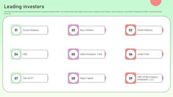 The following slide outlines prominent investment companies invested in Ethic. The slide provides information about Access Ventures, Nyca Partners, Sound Ventures, Union Bank of Switzerland UBS, Urban Investment Fund, etc. Are you in need of a template that can accommodate all of your creative concepts This one is crafted professionally and can be altered to fit any style. Use it with Google Slides or PowerPoint. Include striking photographs, symbols, depictions, and other visuals. Fill, move around, or remove text boxes as desired. Test out color palettes and font mixtures. Edit and save your work, or work with colleagues. Download Leading Investors Value Based Investor Financing Pitch Deck Guidelines Pdf and observe how to make your presentation outstanding. Give an impeccable presentation to your group and make your presentation unforgettable. The following slide outlines prominent investment companies invested in Ethic. The slide provides information about Access Ventures, Nyca Partners, Sound Ventures, Union Bank of Switzerland UBS, Urban Investment Fund, etc.