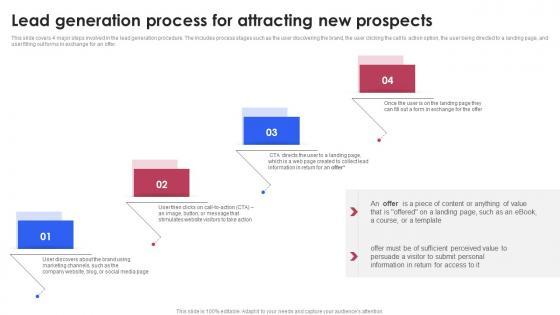 This slide covers 4 major steps involved in the lead generation procedure. The includes process stages such as the user discovering the brand, the user clicking the call to action option, the user being directed to a landing page, and user filling out forms in exchange for an offer. Explore a selection of the finest Lead Generation Process For Attracting New Various Techniques For Managing Brochure PDF here. With a plethora of professionally designed and pre-made slide templates, you can quickly and easily find the right one for your upcoming presentation. You can use our Lead Generation Process For Attracting New Various Techniques For Managing Brochure PDF to effectively convey your message to a wider audience. Slidegeeks has done a lot of research before preparing these presentation templates. The content can be personalized and the slides are highly editable. Grab templates today from Slidegeeks. This slide covers 4 major steps involved in the lead generation procedure. The includes process stages such as the user discovering the brand, the user clicking the call to action option, the user being directed to a landing page, and user filling out forms in exchange for an offer.