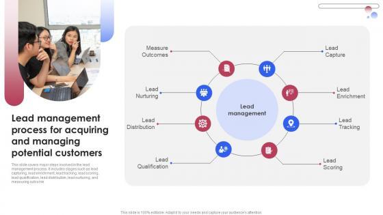 This slide covers major steps involved in the lead management process. It includes stages such as lead capturing, lead enrichment, lead tracking, lead scoring, lead qualification, lead distribution, lead nurturing, and measuring outcome. Slidegeeks is one of the best resources for PowerPoint templates. You can download easily and regulate Consumer Lead Generation Process Lead Management Process For Acquiring And Managing Topics PDF for your personal presentations from our wonderful collection. A few clicks is all it takes to discover and get the most relevant and appropriate templates. Use our Templates to add a unique zing and appeal to your presentation and meetings. All the slides are easy to edit and you can use them even for advertisement purposes.