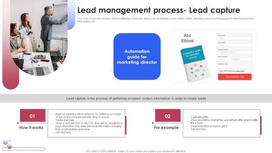 This slide covers the process of lead capturing. It includes steps such as adding a call to action button, directing users to landing page for entering personal information, etc. This Lead Management Process For Acquiring And Various Techniques For Managing Guidelines PDF from Slidegeeks makes it easy to present information on your topic with precision. It provides customization options, so you can make changes to the colors, design, graphics, or any other component to create a unique layout. It is also available for immediate download, so you can begin using it right away. Slidegeeks has done good research to ensure that you have everything you need to make your presentation stand out. Make a name out there for a brilliant performance. This slide covers the process of lead capturing. It includes steps such as adding a call to action button, directing users to landing page for entering personal information, etc.