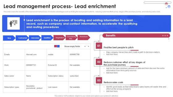 This slide covers the benefits of the lead enrichment process. It includes advantages such as finding the best people to pitch to, reducing customer efforts at key stages of the purchase journey, and reducing sales costs. Do you know about Slidesgeeks Lead Management Process Lead Capture Various Techniques For Managing Topics PDF These are perfect for delivering any kind od presentation. Using it, create PowerPoint presentations that communicate your ideas and engage audiences. Save time and effort by using our pre-designed presentation templates that are perfect for a wide range of topic. Our vast selection of designs covers a range of styles, from creative to business, and are all highly customizable and easy to edit. Download as a PowerPoint template or use them as Google Slides themes. This slide covers the benefits of the lead enrichment process. It includes advantages such as finding the best people to pitch to, reducing customer efforts at key stages of the purchase journey, and reducing sales costs.