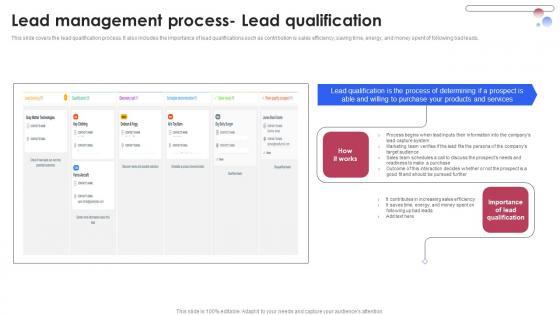 This slide covers the lead qualification process. It also includes the importance of lead qualifications such as contribution is sales efficiency, saving time, energy, and money spent of following bad leads. From laying roadmaps to briefing everything in detail, our templates are perfect for you. You can set the stage with your presentation slides. All you have to do is download these easy-to-edit and customizable templates. Consumer Lead Generation Process Lead Management Process Lead Qualification Slides PDF will help you deliver an outstanding performance that everyone would remember and praise you for. Do download this presentation today.