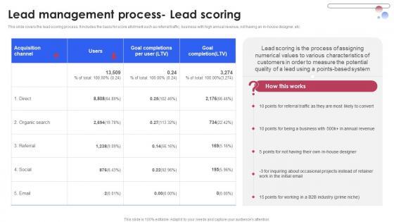This slide covers the lead scoring process. It includes the basis for score allotment such as referral traffic, business with high annual revenue, not having an in-house designer, etc. Create an editable Lead Management Process Lead Nurturing Various Techniques For Managing Sample PDF that communicates your idea and engages your audience. Whether you are presenting a business or an educational presentation, pre-designed presentation templates help save time. Lead Management Process- Lead Nurturing Various Techniques For Managing Sample PDF is highly customizable and very easy to edit, covering many different styles from creative to business presentations. Slidegeeks has creative team members who have crafted amazing templates. So, go and get them without any delay. This slide covers the lead scoring process. It includes the basis for score allotment such as referral traffic, business with high annual revenue, not having an in-house designer, etc.