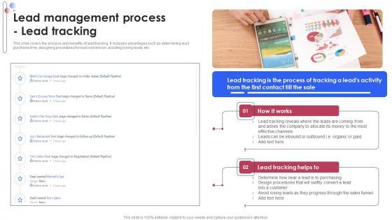 This slide covers the process and benefits of lead tracking. It includes advantages such as determining lead purchase time, designing procedures for lead conversion, avoiding losing leads, etc. Get a simple yet stunning designed Consumer Lead Generation Process Lead Management Process Lead Tracking Designs PDF. It is the best one to establish the tone in your meetings. It is an excellent way to make your presentations highly effective. So, download this PPT today from Slidegeeks and see the positive impacts. Our easy-to-edit Consumer Lead Generation Process Lead Management Process Lead Tracking Designs PDF can be your go-to option for all upcoming conferences and meetings. So, what are you waiting for Grab this template today.