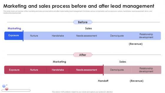 This slide covers an overview of the marketing and sales process before and after implementing lead management. It includes various components such as exposure, nurture, handshake, need assessment, demo, and relationship development. Do you have an important presentation coming up Are you looking for something that will make your presentation stand out from the rest Look no further than Marketing And Sales Process Before And After Lead Various Techniques For Managing Topics PDF. With our professional designs, you can trust that your presentation will pop and make delivering it a smooth process. And with Slidegeeks, you can trust that your presentation will be unique and memorable. So why wait Grab Marketing And Sales Process Before And After Lead Various Techniques For Managing Topics PDF today and make your presentation stand out from the rest. This slide covers an overview of the marketing and sales process before and after implementing lead management. It includes various components such as exposure, nurture, handshake, need assessment, demo, and relationship development.
