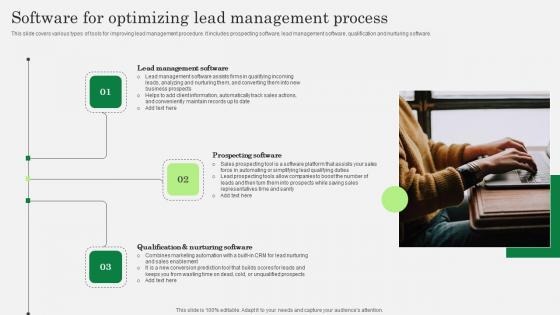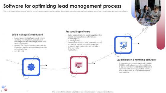 This slide covers various types of tools for improving lead management procedure. It includes prospecting software, lead management software, qualification and nurturing software. Slidegeeks is here to make your presentations a breeze with Optimizing Consumer Lead Nurturing Procedure Software For Optimizing Lead Management Process Themes PDF With our easy to use and customizable templates, you can focus on delivering your ideas rather than worrying about formatting. With a variety of designs to choose from, you are sure to find one that suits your needs. And with animations and unique photos, illustrations, and fonts, you can make your presentation pop. So whether you are giving a sales pitch or presenting to the board, make sure to check out Slidegeeks first.