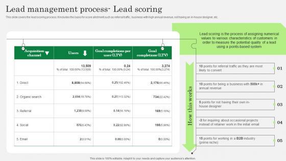 This slide covers the lead scoring process. It includes the basis for score allotment such as referral traffic, business with high annual revenue, not having an in-house designer, etc. Create an editable Lead Management Process Lead Scoring Optimizing Client Lead Handling Demonstration Pdf that communicates your idea and engages your audience. Whether you are presenting a business or an educational presentation, pre-designed presentation templates help save time. Lead Management Process Lead Scoring Optimizing Client Lead Handling Demonstration Pdf is highly customizable and very easy to edit, covering many different styles from creative to business presentations. Slidegeeks has creative team members who have crafted amazing templates. So, go and get them without any delay. This slide covers the lead scoring process. It includes the basis for score allotment such as referral traffic, business with high annual revenue, not having an in-house designer, etc.