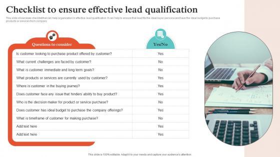 This slide showcases checklist that can help organization in effective lead qualification. It can help to ensure that lead fits the ideal buyer persona and have the ideal budget to purchase products or services from company. From laying roadmaps to briefing everything in detail, our templates are perfect for you. You can set the stage with your presentation slides. All you have to do is download these easy-to-edit and customizable templates. Telesales Strategy For Targeting Checklist To Ensure Effective Lead Qualification Strategy SS V will help you deliver an outstanding performance that everyone would remember and praise you for. Do download this presentation today. This slide showcases checklist that can help organization in effective lead qualification. It can help to ensure that lead fits the ideal buyer persona and have the ideal budget to purchase products or services from company.