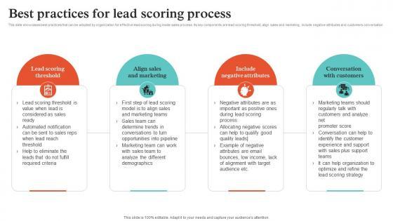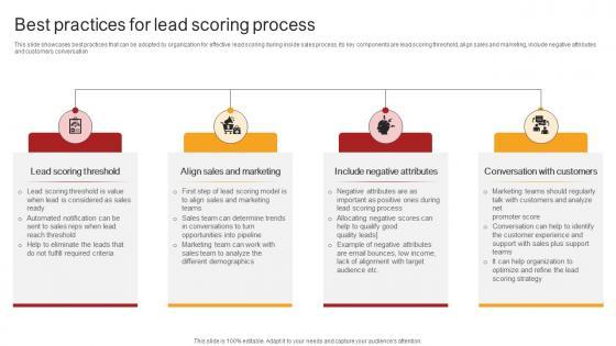 This slide showcases best practices that can be adopted by organization for effective lead scoring during inside sales process. Its key components are lead scoring threshold, align sales and marketing, include negative attributes and customers conversation. Create an editable Remote Sales Plan For Best Practices For Lead Scoring Process Strategy SS V that communicates your idea and engages your audience. Whether you are presenting a business or an educational presentation, pre-designed presentation templates help save time. Remote Sales Plan For Best Practices For Lead Scoring Process Strategy SS V is highly customizable and very easy to edit, covering many different styles from creative to business presentations. Slidegeeks has creative team members who have crafted amazing templates. So, go and get them without any delay. This slide showcases best practices that can be adopted by organization for effective lead scoring during inside sales process. Its key components are lead scoring threshold, align sales and marketing, include negative attributes and customers conversation.
