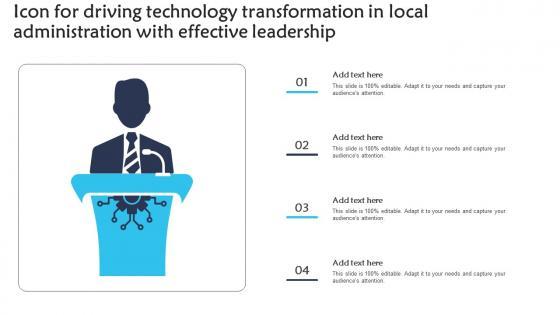 Showcasing this set of slides titled Icon For Driving Technology Transformation In Local Administration With Effective Leadership Diagrams pdf. The topics addressed in these templates are Icon, Driving Technology Transformation, Local Administration, Effective Leadership. All the content presented in this PPT design is completely editable. Download it and make adjustments in color, background, font etc. as per your unique business setting. Our Icon For Driving Technology Transformation In Local Administration With Effective Leadership Diagrams pdf are topically designed to provide an attractive backdrop to any subject. Use them to look like a presentation pro.