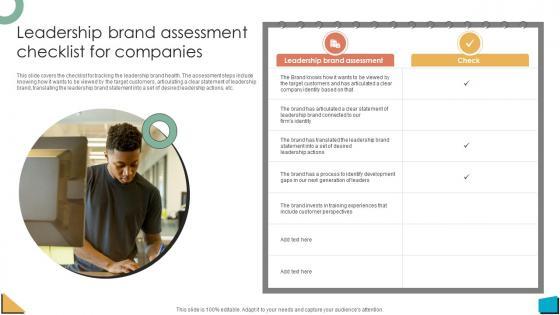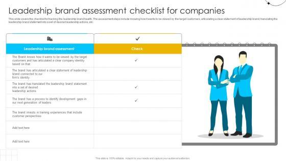 This slide covers the checklist for tracking the leadership brand health. The assessment steps include knowing how it wants to be viewed by the target customers, articulating a clear statement of leadership brand, translating the leadership brand statement into a set of desired leadership actions, etc. From laying roadmaps to briefing everything in detail, our templates are perfect for you. You can set the stage with your presentation slides. All you have to do is download these easy to edit and customizable templates. Leadership Brand Assessment Checklist For Companies Portrait PDF will help you deliver an outstanding performance that everyone would remember and praise you for. Do download this presentation today.