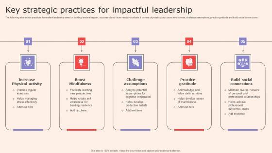 The following slide covers elements required for building resilience aimed at keeping leaders psychologically sound for inspiring and producing new skills. It consists of managing personal resources, stress and team members Pitch your topic with ease and precision using this Key Strategic Practices For Impactful Leadership Slides Pdf. This layout presents information on Increase Physical Activity, Boost Mindfulness, Challenge Assumptions . It is also available for immediate download and adjustment. So, changes can be made in the color, design, graphics or any other component to create a unique layout. The following slide covers elements required for building resilience aimed at keeping leaders psychologically sound for inspiring and producing new skills. It consists of managing personal resources, stress and team members