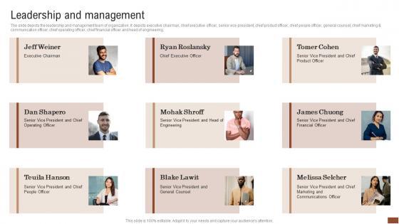 The slide depicts the leadership and management team of organization. It depicts executive chairman, chief executive officer, senior vice president, chief product officer, chief people officer, general counsel, chief marketing and communication officer, chief operating officer, chief financial officer and head of engineering. From laying roadmaps to briefing everything in detail, our templates are perfect for you. You can set the stage with your presentation slides. All you have to do is download these easy to edit and customizable templates. Leadership And Management Talent Recruitment Company Outline Template Pdf will help you deliver an outstanding performance that everyone would remember and praise you for. Do download this presentation today. The slide depicts the leadership and management team of organization. It depicts executive chairman, chief executive officer, senior vice president, chief product officer, chief people officer, general counsel, chief marketing and communication officer, chief operating officer, chief financial officer and head of engineering.