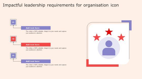The following slide outlines strategies for reliance in leadership aimed at identifying ways to support employees individually with team to navigate unfamiliar circumstances. It covers using data and feedback, goal clarity, distribute authority and assessment Pitch your topic with ease and precision using this Impactful Leadership Requirements For Organisation Icon Information Pdf. This layout presents information on Impactful Leadership, Requirements Organisation Icon. It is also available for immediate download and adjustment. So, changes can be made in the color, design, graphics or any other component to create a unique layout. The following slide outlines strategies for reliance in leadership aimed at identifying ways to support employees individually with team to navigate unfamiliar circumstances. It covers using data and feedback, goal clarity, distribute authority and assessment