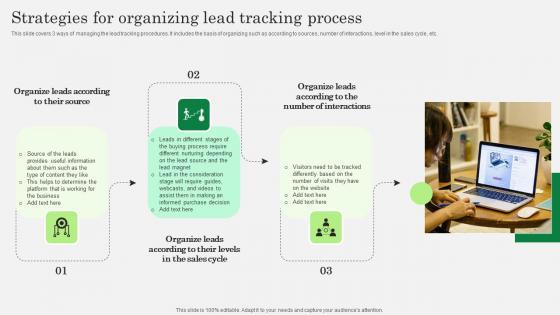 This slide covers 3 ways of managing the lead tracking procedures. It includes the basis of organizing such as according to sources, number of interactions, level in the sales cycle, etc. Slidegeeks is one of the best resources for PowerPoint templates. You can download easily and regulate Strategies For Organizing Lead Tracking Process Improving Lead Generation Process Designs PDF for your personal presentations from our wonderful collection. A few clicks is all it takes to discover and get the most relevant and appropriate templates. Use our Templates to add a unique zing and appeal to your presentation and meetings. All the slides are easy to edit and you can use them even for advertisement purposes.