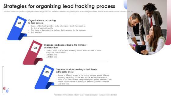 This slide covers 3 ways of managing the lead tracking procedures. It includes the basis of organizing such as according to sources, number of interactions, level in the sales cycle, etc. Slidegeeks is one of the best resources for PowerPoint templates. You can download easily and regulate Strategies For Organizing Lead Tracking Process Enhancing Client Lead Conversion Rates Topics PDF for your personal presentations from our wonderful collection. A few clicks is all it takes to discover and get the most relevant and appropriate templates. Use our Templates to add a unique zing and appeal to your presentation and meetings. All the slides are easy to edit and you can use them even for advertisement purposes.