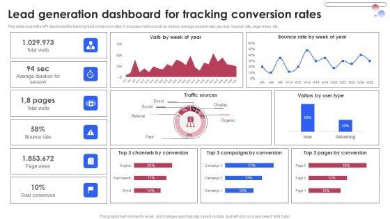 This slide showcases dashboard for lead generation that can help organziation to identify the traffic sources plus visitors and make changes in SEO of website. It also showcases key metrics that are bounce rate by week, visitors by user type, top channels by conversion, top campaign by conversion and top pages by conversion. Pitch your topic with ease and precision using this Website Leads Tracking Dashboard With Traffic Sources Infographics PDF. This layout presents information on Visitors User Type, Traffic Sources, Bounce Rate Week. It is also available for immediate download and adjustment. So, changes can be made in the color, design, graphics or any other component to create a unique layout.