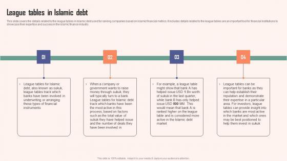 This slide covers the details related to the league tables in Islamic debt used for ranking companies based on Islamic financial metrics. It includes details related to the league tables are an important tool for financial institutions to showcase their expertise and success in the Islamic finance industry. Want to ace your presentation in front of a live audience Our League Tables In Islamic Debt Comprehensive Guide Islamic Pictures PDF can help you do that by engaging all the users towards you. Slidegeeks experts have put their efforts and expertise into creating these impeccable powerpoint presentations so that you can communicate your ideas clearly. Moreover, all the templates are customizable, and easy-to-edit and downloadable. Use these for both personal and commercial use. This slide covers the details related to the league tables in Islamic debt used for ranking companies based on Islamic financial metrics. It includes details related to the league tables are an important tool for financial institutions to showcase their expertise and success in the Islamic finance industry.
