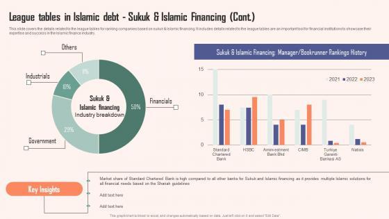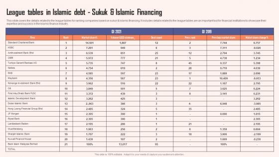 This slide covers the details related to the league tables in Islamic debt used for ranking companies based on Islamic financial metrics. It includes details related to the league tables are an important tool for financial institutions to showcase their expertise and success in the Islamic finance industry. Presenting this PowerPoint presentation, titled League Tables In Islamic Debt A Detailed Knowledge Of Islamic Finance Demonstration Pdf, with topics curated by our researchers after extensive research. This editable presentation is available for immediate download and provides attractive features when used. Download now and captivate your audience. Presenting this League Tables In Islamic Debt A Detailed Knowledge Of Islamic Finance Demonstration Pdf. Our researchers have carefully researched and created these slides with all aspects taken into consideration. This is a completely customizable League Tables In Islamic Debt A Detailed Knowledge Of Islamic Finance Demonstration Pdf that is available for immediate downloading. Download now and make an impact on your audience. Highlight the attractive features available with our PPTs. This slide covers the details related to the league tables in Islamic debt used for ranking companies based on Islamic financial metrics. It includes details related to the league tables are an important tool for financial institutions to showcase their expertise and success in the Islamic finance industry.