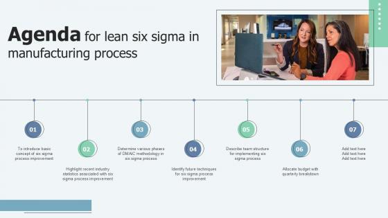 Find a pre-designed and impeccable Agenda For Lean Six Sigma In Manufacturing Process Ppt Example. The templates can ace your presentation without additional effort. You can download these easy-to-edit presentation templates to make your presentation stand out from others. So, what are you waiting for Download the template from Slidegeeks today and give a unique touch to your presentation. Our Agenda For Lean Six Sigma In Manufacturing Process Ppt Example are topically designed to provide an attractive backdrop to any subject. Use them to look like a presentation pro.
